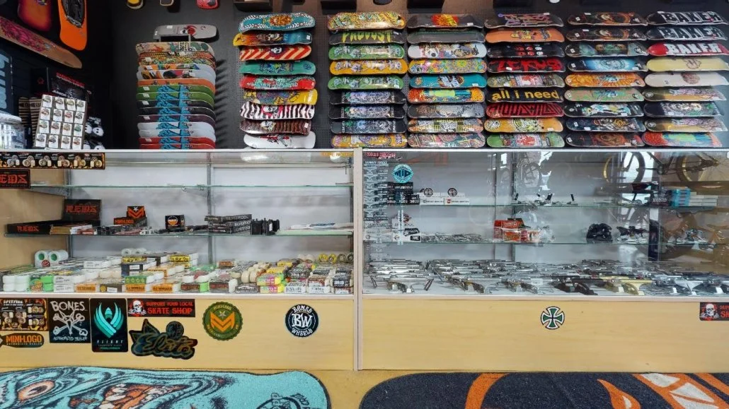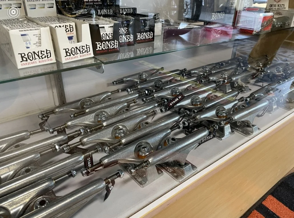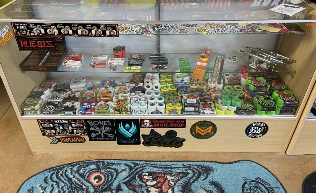 We have a great selection of trucks, wheels, bearings, grip tape, wax, rails, hardware, helmets, pads and stickers. We have you covered for all your skating needs. We are happy to re-grip a board while you wait or swap out parts for you. We are a full service skate shop and here to help.